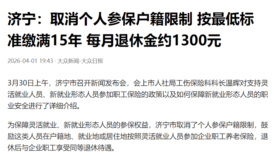 山东济宁人社局说济宁市取消了个人参保户籍限制,鼓励灵活就业人员参加企业职工养老保险。经测算,2025年之前退休的灵活就业人员,按最低缴费标准累计缴费满15年,缴费本金约10.8万元,退休后每月领取退休金约1300元,每年领取取暖费1700元,一年领取合计约1.7万元,7年左右可领回本金。