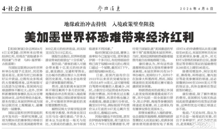 4月6日出版的《参考消息》刊发美国《财富》杂志网站署名文章,题为《美加墨世界杯恐难带来经济红利》。全文如下: